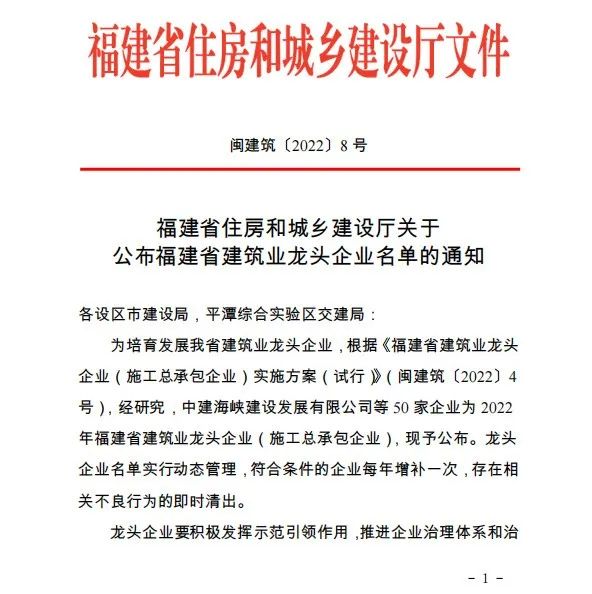 近日,福建省住房和城乡建设厅公布了2022年福建省建筑业龙头企业名单,我公司成功入选。