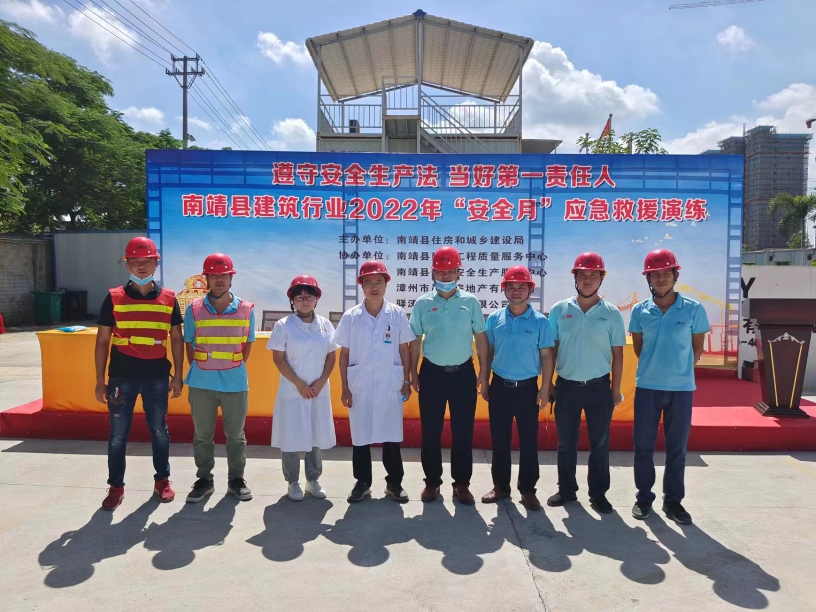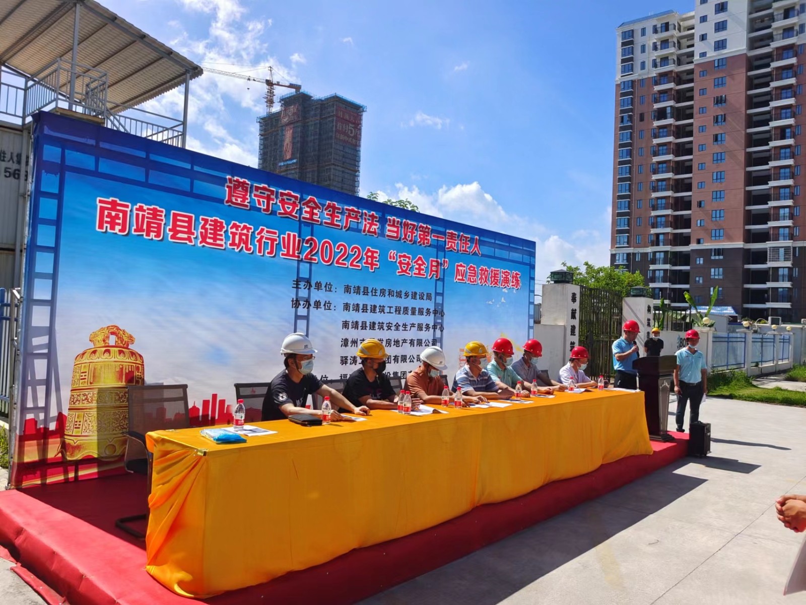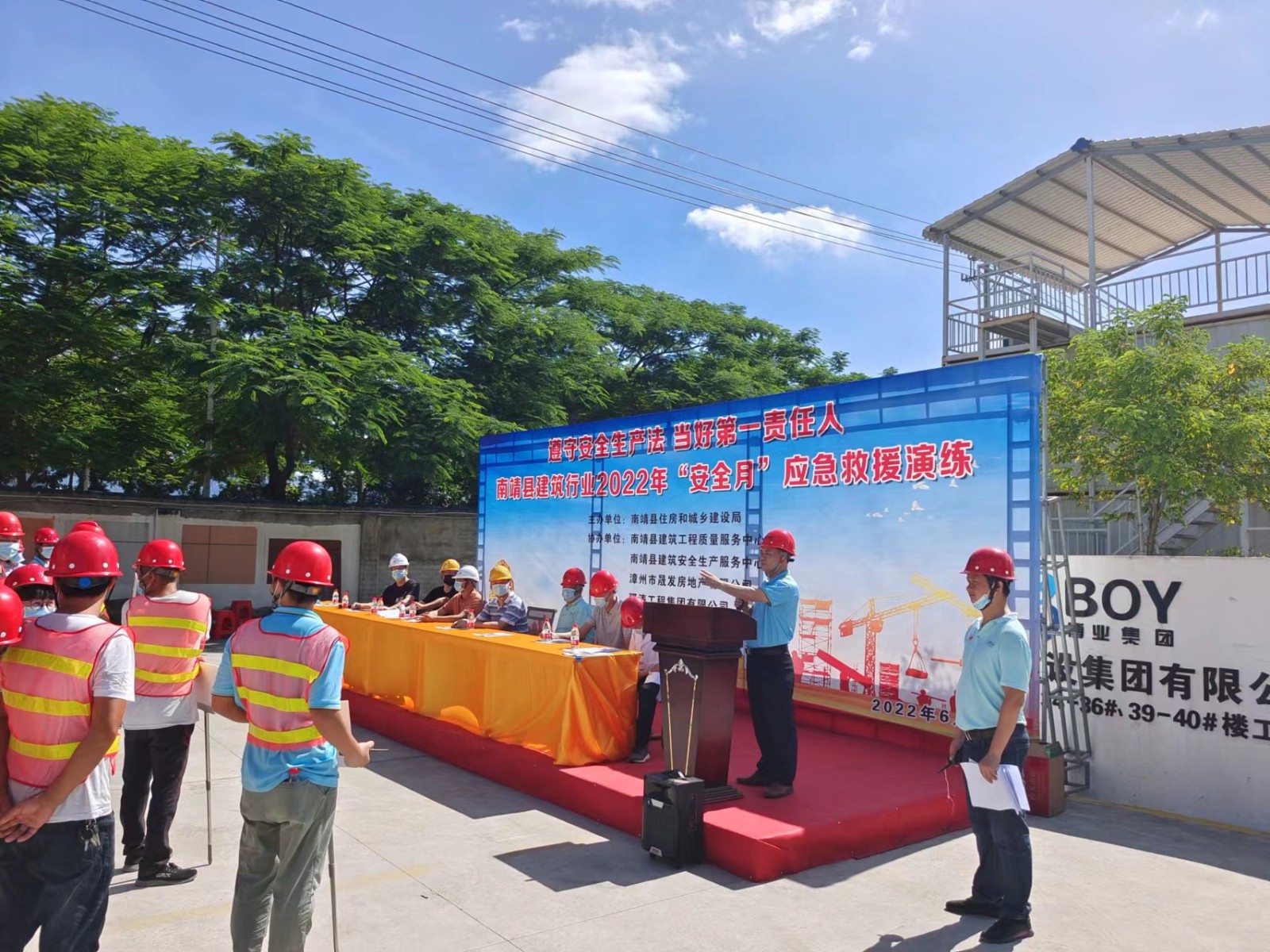 28日,公司承办的南靖县建筑行业2022“安全月”应急救援演练在晟发名都项目举行,南靖县建设局总工简东海、南靖县建设工程质量安全服务中心主任吴建清、漳州市晟发房地产有限公司常务副总陈奕、总经理助理蔡志佳等单位领导莅临现场,公司副总经理张春进、晟发名都项目第一责任人吴水熙、项目经理林金水及项目部管理代表等人参加。本次演练意在提升全员应急救援响应速度和应急救援能力,普及急救安全知识,营造良好的安全生产氛围。